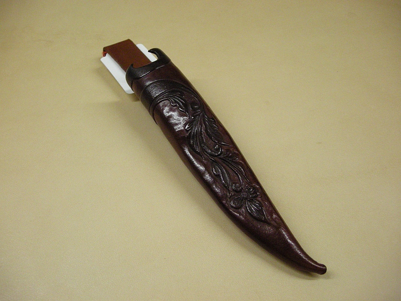 Messerscheide nordischer Art, braun gefärbt mit Blumenmuster.