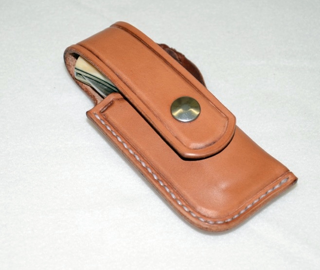 Etui für Klappmesser, naturbelassen, eingeschnittener geschrägter Rand, Handnaht, polierte Kanten.