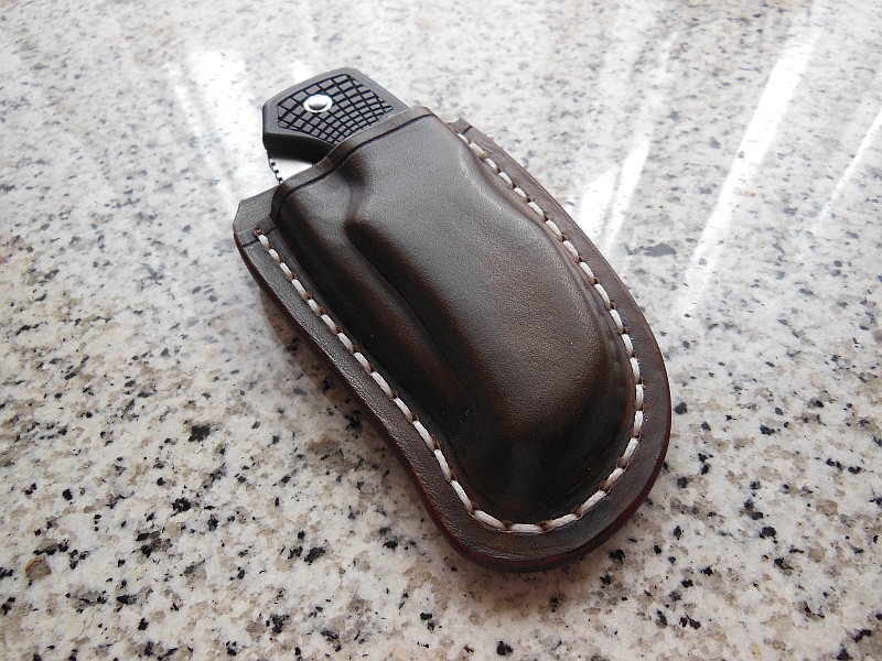 Etui für Klappmesser in dunkelbraun mit Einschnappfunktion, polierte Kanten.