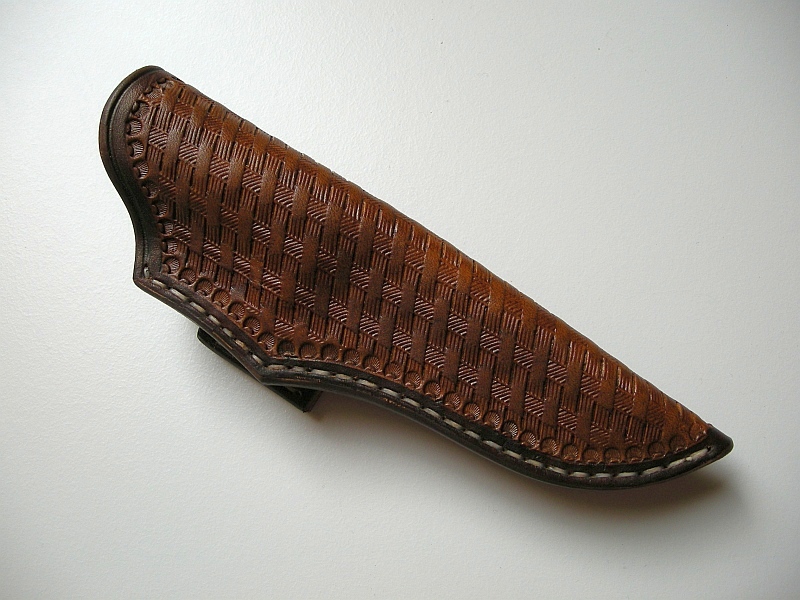 Messerscheide, Basket Punzierung, Handnaht, polierte Kanten.