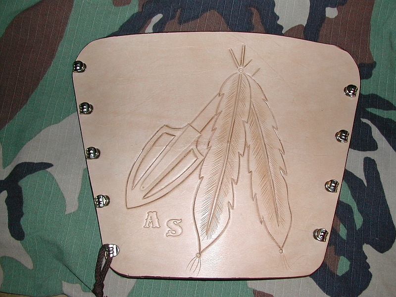 Armschutz mit Motiv Federn und Jagdspitze, mit Schnürverschluss.
