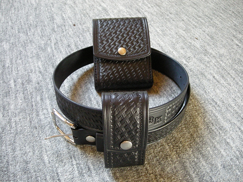Gürtel mit Handytasche und Etui für Flachmann, alles in schwarz, punziert mit Flechtmuster.