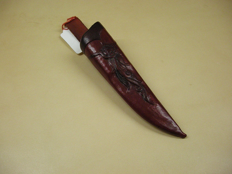 Messerscheide nordischer Art, braun gefärbt mit Blumenmuster.